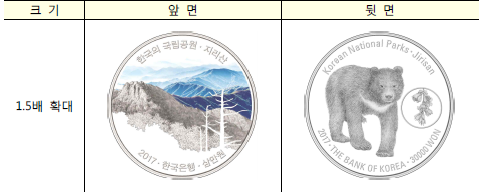 지리산 주화 앞면은 천왕봉과 광활한 지리산 연봉의 모습을 묘사, 뒷면은 깃대종인 반달가슴곰과 히어리의 모습을 묘사한다.