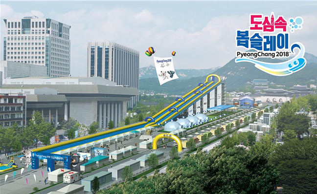 ‘도심 속 봅슬레이’ 행사는 300미터 초대형 워터슬라이드, 2018 평창대회 홍보체험관, K-P0P 가수와 인기 DJ 음악 공연, 음식축제 등으로 구성되어 광화문광장을 풍성하게 채울 예정이다.