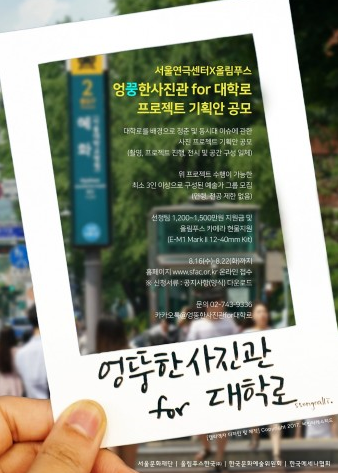 (교통문화신문) 서울문화재단 서울연극센터가 한국문화예술위원회와 한국메세나협회, 광학 전문기업 올림푸스한국과 함께 진행하는 <엉뚱한 사진관 for 대학로>의 프로젝트 기획안을 16일(수)부터 22일(금)까지 일주일간 공모한다고 밝혔다.