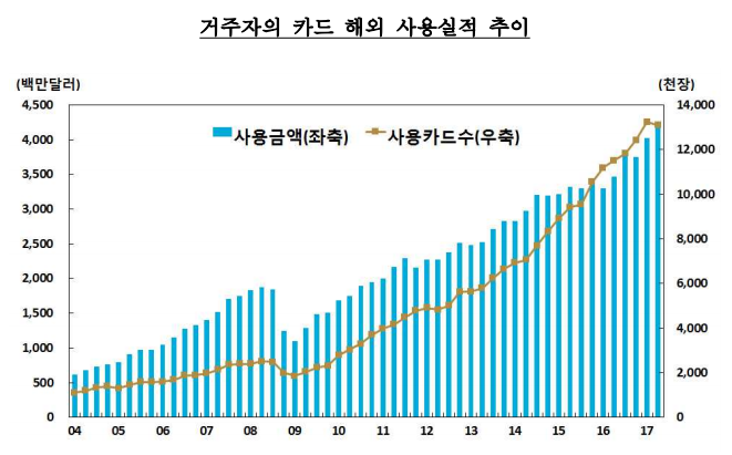 (교통문화신문) 한국은행은 2017년 2/4분기중 거주자가 카드(신용 + 체크 + 직불)로 해외에서
