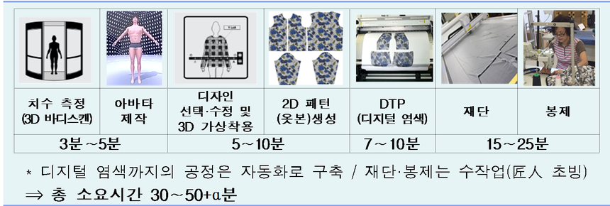 ‘DTP(디지털 염색) → 재단 → 봉제’ 과정을 의류매장에 구축하여 맞춤형 의류를 즉시 생산할 수 있는 시스템을 구현하였다.