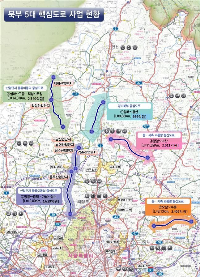 경기도는 이밖에도 현재 ▲국도대체우회도로 3호선(동두천 상패~연천 청산) 9.9km, ▲국지도 39호선(양주 장흥~광적, 가납~상수) 12km, ▲지방도 371호선(파주 설마~구읍, 연천 적성~두일) 14.4km, ▲국지도 98호선(남양주 오남~수동) 8.1km 등을 5대 핵심도로사업으로 추진 중에 있다.
