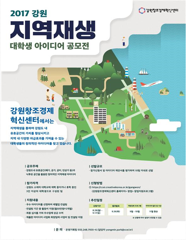 (교통문화신문) 강원창조경제혁신센터 (이하 ‘강원센터’)는 다음달 17일까지 강원도 내 대학생을 대상으로 ‘2017 강원 지역재생 대학생 아이디어 공모전’을 개최한다고 28일 밝혔다.