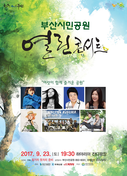 부산시민공원 ‘열린콘서트’는 불타는 청춘의 원조 댄싱퀸 김완선, 포크 싱어송라이터 장필순, 9인조 자메이카 스카(Ska)음악 밴드 킹스턴루디스카, 트로트 가수 진성과 유지나, 프랑스유학파 싱어송라이터 스텔라 장, 훈남 트로트 듀오 후니용이 등이 출연하여 신명나고 흥겨운 무대를 선사할 계획이다.