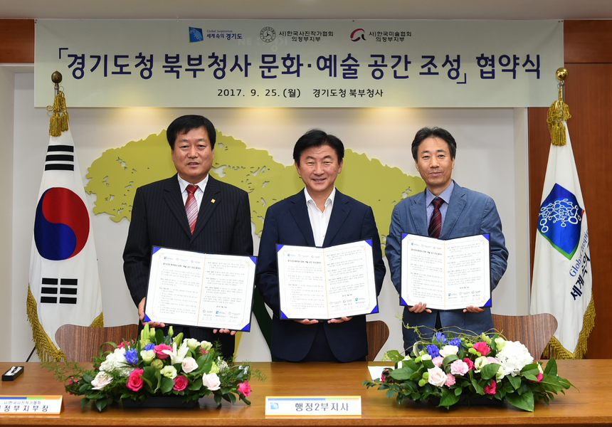 김동근 경기도 행정2부지사는 25일 경기도청 북부청사 도민접견실에서 김덕기 한국사진작가협회 의정부지부장, 임응섭 한국미술협회 의정부지부장과 함께 이 같은 내용을 담은 ‘경기도청 북부청사 문화예술 공간 조성 업무협약’에 서명했다.
