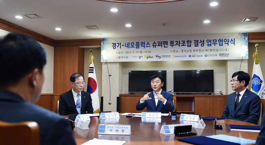 김동근 경기도 행정2부지사는 25일 오후 2시 경기도청 북부청사 제1회의실에서 이상하 ㈜네오플럭스 대표이사, 성기홍 한국벤처투자㈜ 총괄본부장, 최광수 농협은행㈜ 경기영업본부장, 양성관 기업은행 투자금융부장, 백승희 ㈜신한은행 경기중부본부장, 한의녕 경기도경제과학진흥원장과 함께 ‘슈퍼맨펀드 3호 결성 업무협약’을 맺고 우수한 기술력과 성장잠재력을 보유한 유망 기업 투자에 협력하기로 합의했다.