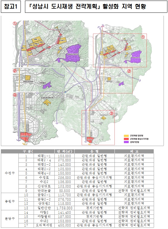 국토부 진단 결과 성남시는 48개 행정동 중 73%인 35개동이 쇠퇴지역으로 나타났다. 시는 이 가운데 ▲수정구 태평동 등 9개 지역 ▲중원구 상대원 등 4개 지역 ▲분당구 야탑3동 등 4개 지역을 포함해 총 17개 지역을 도시재생 활성화지역으로 지정했다. 유형별로는 일반근린형 11개소, 중심시가지형 4개소, 경제기반형 2개소다.