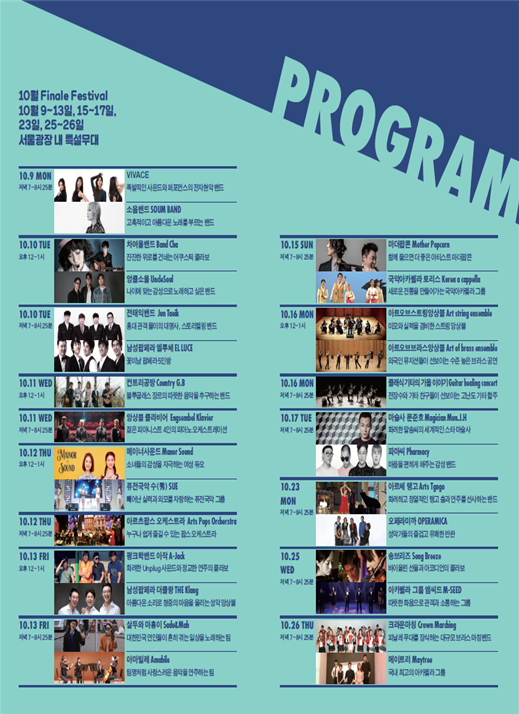 오는 10월은 <2017 문화가 흐르는 서울광장> 특별무대의 마지막을 장식하는 ‘피날레 페스티벌’을 주제로 시민들에게 고품격 음악을 선사할 수준 높은 아티스트를 초청하여 화려한 피날레 무대를 꾸민다.
