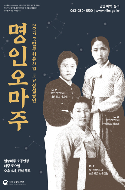 오는 14일부터 3주간 매주 토요일마다 선보이는 이번 공연은 ▲ 후덕한 성품으로 많은 제자를 이끌며, 예술학교 설립 등 후학을 위해 애쓴 고(故) 미산(眉山) 박초월 작고 보유자(1917~1983, 국가무형문화재 제5호 판소리 보유자/10.14.), ▲ 초기 산조의 맛이 담뿍 담긴 선율을 힘 있는 가야금 연주로 펼쳐냈던 명인 고(故) 소운(昭芸) 함금덕 작고 보유자(1917~1994, 국가무형문화재 제23호 가야금산조 및 병창/10.21.), ▲ 제24회 서울 올림픽 당시 세계 수십억 인구에게 당당한 우리 소리로 감동을 선사한 고(故) 만정(晩庭) 김순옥 작고 보유자(1917~1995, 국가무형문화재 제5호 판소리/10.28.)의 무대를 만날 수 있다.