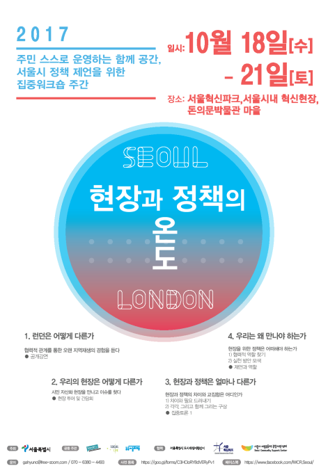 집중워크숍은 “현장과 정책의 온도”라는 주제로 런던의 지역재생 사례를 공유하는 기조강연, 주민주도 지역재생이 벌어지는 현장투어, 런던혁신기관 로컬리티와 소셜라이프가 직접 꾸리는 컨설팅 프로세스 워크숍, 다양한 전문가를 초빙하는 집중토론 프로그램으로 구성된다.
