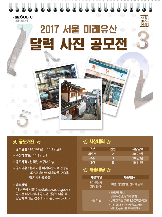 2017 서울 미래유산 달력사진 공모전 접수는 ‘내 손안에 서울(http://mediahub.seoul.go.kr)’ 공모전 이벤트 페이지에서 신청서를 받은 후 작성해 담당자 메일(phm@yjnw.co.kr)로 보내면 된다. 수상자는 오는 11월 17일(금) 13명을 선정해 발표할 예정이다.