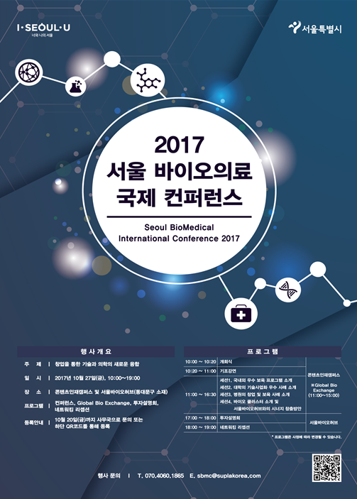 (교통문화신문) 서울시는 서울 바이오 의료산업 육성에 대한 정책적 의지를 국내·외에 알리고 바이오 클러스터간 협력 네트워크를 구축하기 위해 ‘2017 서울 바이오 의료 국제 콘퍼런스’를 10월 27일(금), 콘텐츠인재캠퍼스(동대문구 회기로 66)와 서울바이오허브(동대문구 회기로 117-3)에서 개최한다고 밝혔다.
