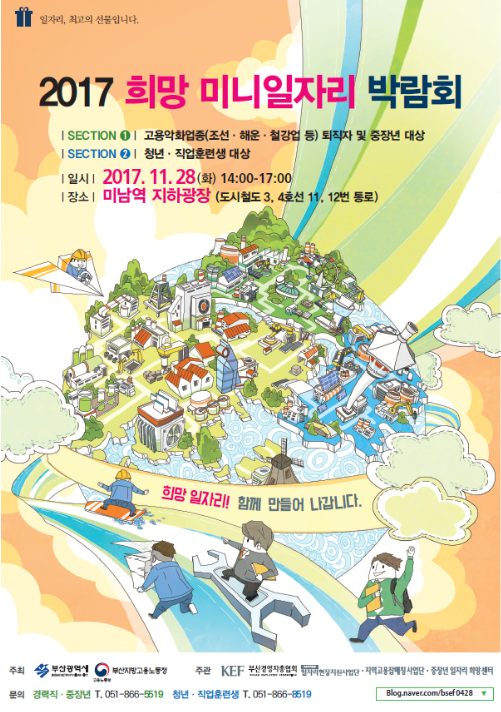 (교통문화신문) 부산시와 부산지방고용노동청, 부산경영자총협회는 11월 28일 오후 2시부터 5시까지 도시철도 3,4호선 미남역 지하광장(11번, 12번 통로)에서「2017 희망 미니일자리 박람회」를 개최한다고 밝혔다.