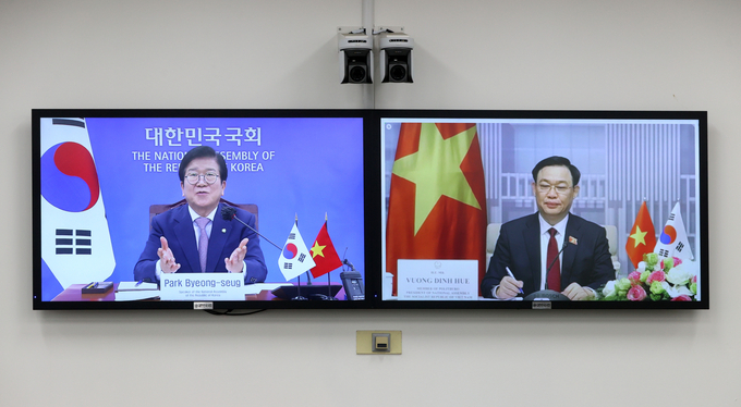 박병석 국회의장은 23일 오전 국회 영상회의실에서 브엉 딩 후에 베트남 국회의장과 화상 회담을 갖고 “베트남에게 한국은 1위 투자국, 2대 공적개발원조(ODA) 지원국이자 3대 교역국”이라며 “약 8,000개 우리 기업이 베트남에서 활동하고 있는데 (베트남) 입국 승인이 지연되고 자가격리 기간이 너무 길다. 우리 기업·금융인에게 특별입국제도를 재개해주길 바란다”고 말했다.