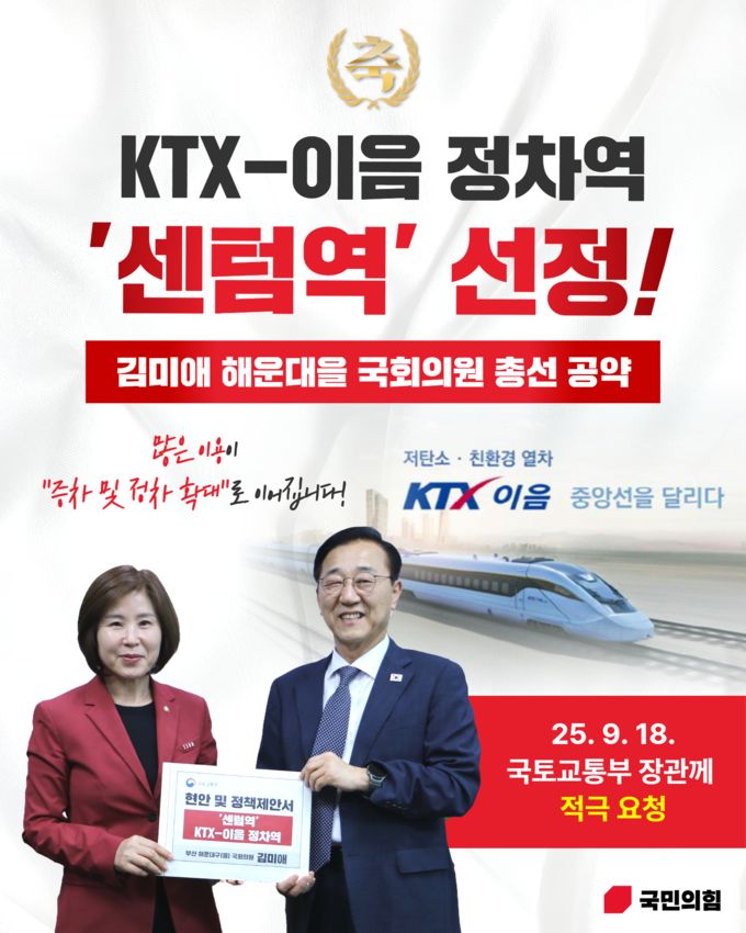 김미애 의원은 “센텀역 KTX-이음 정차는 수도권 접근성을 크게 개선해 기업 유치와 산업 활성화, 관광·MICE 경쟁력 강화로 이어질 중요한 전환점이 될 것”이라며 “제2센텀 조성과 맞물려 부산의 미래 성장 기반을 더욱 단단히 하는 계기가 될 것으로 기대한다”고 말했다.