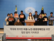 김예지 의원, 학대에 취약한 아동・노인・중증장애인 권리 구제 위한 4개 법안 대표발의! 학대행위 입증을 위해 제3자 대화 녹음을 예외적 허용하고 증거능력 인정하도록 김 의원, “스스로 방어 어려운 아동・노인・중증장애인의 권리 구제 위해 법안 통과에 최선 다할 것” 국회 보건복지위원회 소속 김예지 국회의원(국민의힘, 비례대표)은 19일 국회 소통관에서 전국장애인부모연대, 장애우권익문제연구소, 장애인차별금지추진연대, 한국피플퍼스트와 기자회견을 열고, 학대에 취약한 아동・노인・중증장애인의 권리 구제를 위한 「아동학대범죄의 처벌 등에 관한 특례법」(이하 「아동학대처벌법」), 「노인복지법」, 「장애인복지법」 및 「통신비밀보호법」 일부개정법률안을 대표발의했다고 밝혔다. 현행 「통신비밀보호법」은 공개되지 않은 타인 간의 대화를 제3자가 녹음하거나 청취하는 행위를 금지하고 있으며, 이러한 방식으로 수집된 증거는 형사재판에서 사용할 수 없다. 그러나 증거를 스스로 확보하기 어려운 아동‧노인‧중증장애인 학대 사건에서는 가족 등 제3자가 수집한 녹음자료의 증거능력이 인정되지 않을 경우, 학대 사실 규명과 가해자 처벌이 극도로 어려워지는 문제가 지속적으로 제기되어 왔다. 최근 용