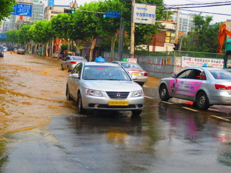 이로인해 도로에 많은물이 한꺼번에 몰린관계로 하수구로 모두 배수가 되질않아 인근 주변의 주택가 및 상가를 침수시키는 소동이 벌어졌다