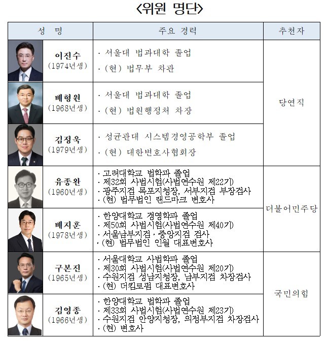 특별검사후보추천위원회 위원으로 이진수 법무부 차관·배형원 법원행정처 차장·김정욱 대한변호사협회 회장(이상 당연직), 유종완·배지훈 변호사(이상 더불어민주당 추천), 구본진·김영종 변호사(이상 국민의힘 추천)가 위촉됐다.