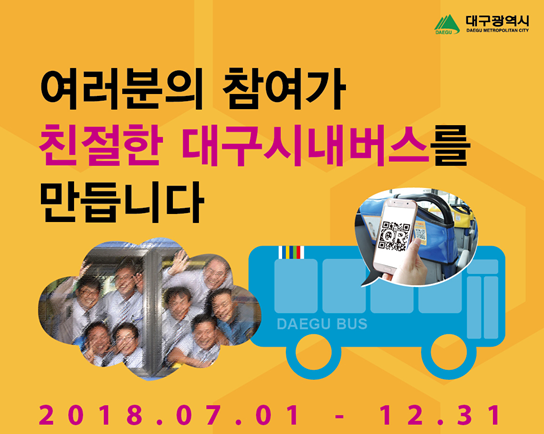 (교통문화신문) 대구시는 버스이용 시민들이 스마트폰으로 버스내부에 부착된 QR코드를 스캔하여 친절기사를 추천하는 온라인 추천 방식을 7월 1일부터 12월 31일까지 진행한다.