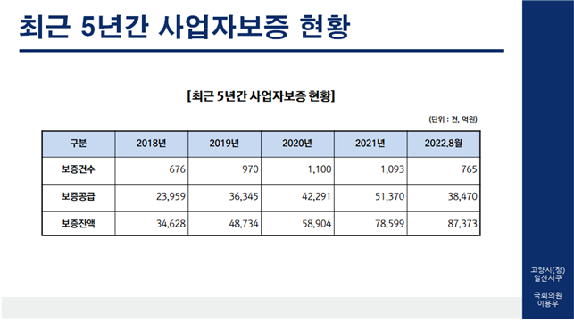 - 이용우 의원, 사업자보증의 경우 중소건설업체가 96.3%로 대부분을 차지해 사업자보증 부실 리스크 커질 수 밖에 없어