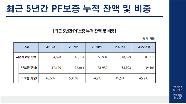 주택금융공사에서는 개인보증 뿐만 아니라 주택건설자금 보증, PF보증 등의 사업자보증을 제공하고 있다. 주택금융공사에서 제출한 최근 5년간 사업자보증현황 자료에 따르면 보증잔액이 지속적으로 증가하고 있고. 22년 8월 기준 보증잔액은 약 9조원에 달한다. 이 중 PF보증 잔액도 점점 증가하는 추세이며, 올해 8월 기준 누적 잔액은 약 4조원으로, 전체 사업자보증의 45%나 차지하고 있다.