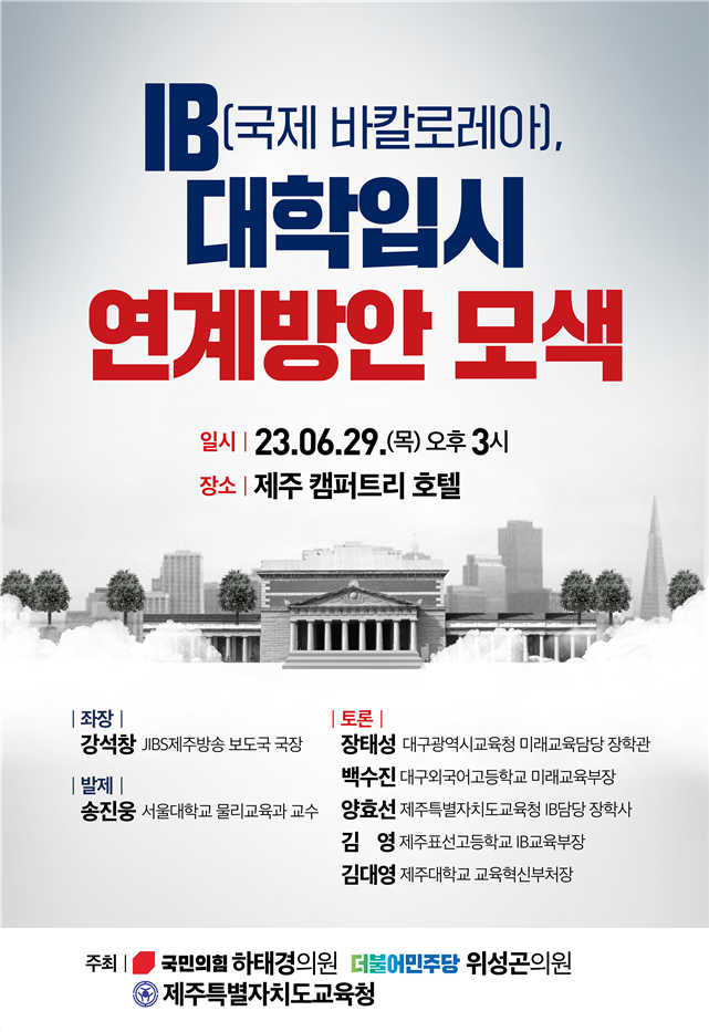- 오는 29일(목) 오후 3시, 제주도 캠퍼트리 호텔에서 위성곤 의원·제주도교육청과 <IB, 대학입시 연계방안 모색> 세미나 개최... 지난 2월 <IB, 공교육 도입 의의와 과제> 세미나에 이은 후속으로 열려