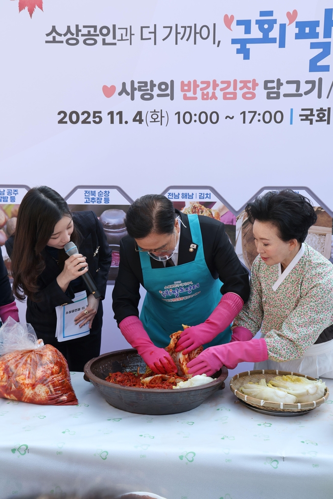 우원식 국회의장은 4일 국회 소통관 앞 광장에서 열린 '소상공인과 더 가까이, 국회 팔도장터 사랑의 반값김장 담그기' 행사에 참여했다. 우 의장은 "국내 경기가 어려운데, 소상공인들이 살아야 대한민국이 살고, 경제도 튼튼해진다"며 "소상공인을 잘 살리는 예산이 편성될 수 있도록 국회의장으로서 최선을 다하겠다"고 약속했다.