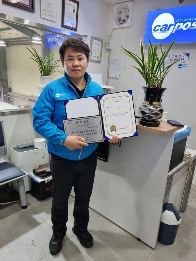 이에따라 서울 강동구에 위치한 중급 정비업체를 23년최초 로 우수기업의 영예를 차지한 코리아모터스 정비센타 를 선정하여 우수기업 패와 선정증서를 전달했다