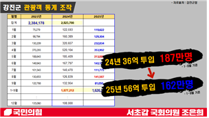 - 조은희 “올해 예산 20억(‘24년比) 늘었는데, 관광객수는 15%(25만명) 줄어”...“별도 운영비 10억까지 지역화폐로 수십억 혈세 허공낭비”