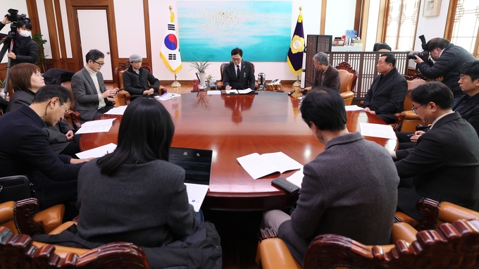 우원식 국회의장이 28일(수) 오전 의장집무실에서 시민개헌넷 대표단과 국민투표법 개정과 개헌의 필요성을 논의하고 있다.(사진=국회사무처 사진팀)