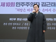 우원식 국회의장은 12일(목) 오전 국회의원회관에서 열린 '제10회 민주주의자 김근태상 시상식'에 참석해 수상자들을 축하하고 김근태 정신의 계승과 실천을 강조했다. '김근태상'은 우리 사회의 민주주의 발전에 헌신한 이들을 조명하기 위해 2016년 제정됐으며, 지난 9회 시상식에서는 우 의장이 본상을 수상한 바 있다.