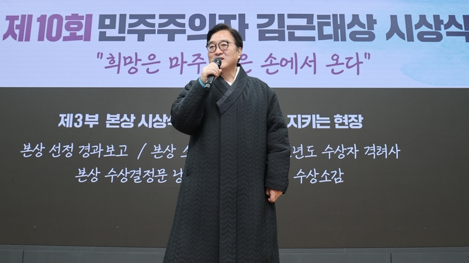 우 의장은 "김근태 정신은 어떤 어려움 속에서도 평화, 인권, 그리고 사람의 가치를 가장 중요하게 생각하는 것"이라며 "우리나라 민주주의를 앞장서서 끌어온 민주주의자 김근태상을 수상했다는 것은 정말 영광스러운 일"이라고 말했다.