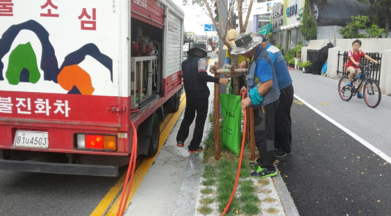 특히, 가로수는 물주기 효과가 오래가도록 물주머니를 설치해서 급수를 실시하고, 차량 진입이 곤란한 근린공원, 어린이 공원은 양수기와 호스를 활용해 실시한다.